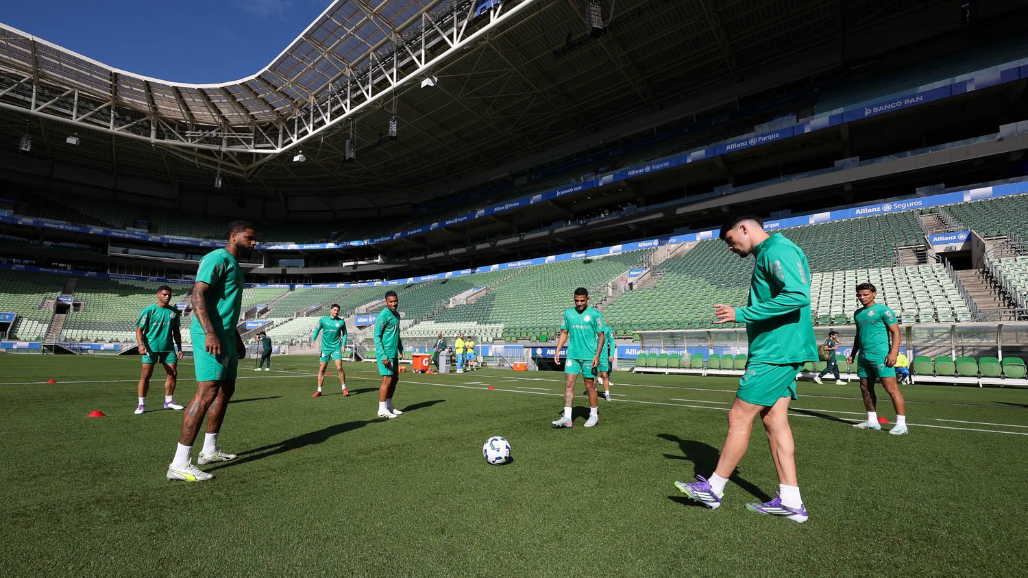 O Palmeiras foi ao Allianz Parque na manhã deste domingo (13) e deu sequência à preparação para o duelo com o Mirassol, na quarta-feira (16), às 19h, na própria arena alviverde, pela 14ª rodada do Campeonato Brasileiro. A volta ao estádio após um mês e meio (a última partida foi a vitória por 6 a 0 sobre o Sporting Cristal-PER, pela CONMEBOL Libertadores, no dia 28 de maio) ocorreu porque o campo sintético da Academia de Futebol está em reforma.