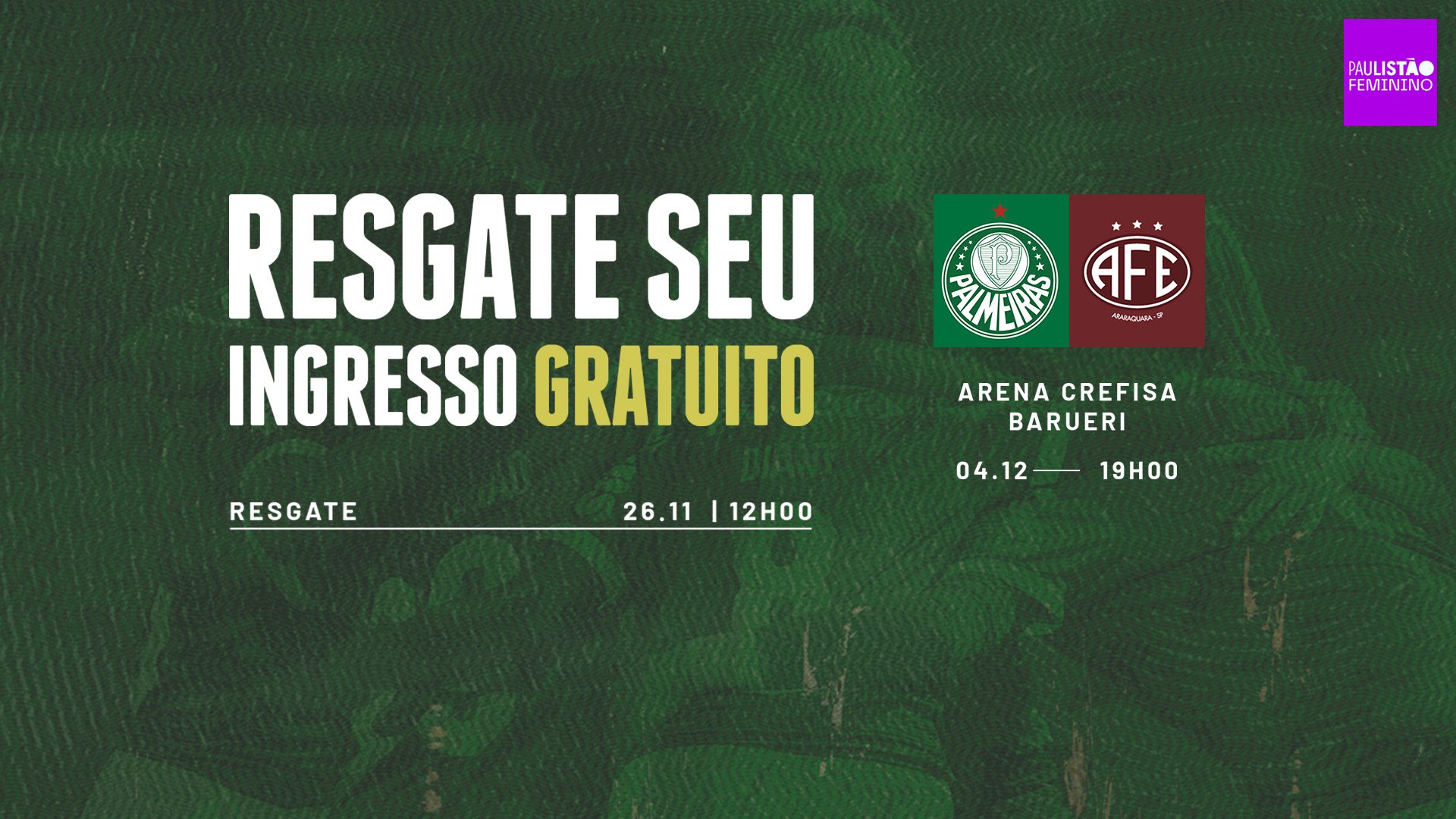 O Palmeiras enfrenta a Ferroviária, no dia 4 de dezembro, às 19h, na Arena Crefisa Barueri, pelo jogo de volta da semifinal do Paulista Feminino. A entrada será gratuita e o resgate do ingresso poderá ser feito a partir desta quarta-feira (26), às 12h, pelo site palmeiras.soudaliga.com.br – o acesso será feito por meio de reconhecimento facial.