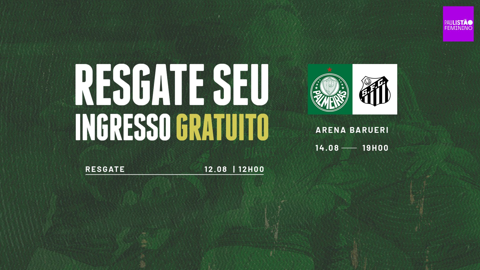 Pelo Campeonato Paulista Feminino, o Palmeiras recebe o Santos na próxima quinta-feira (14), às 19h, na Arena Barueri. A entrada será gratuita e o resgate do ingresso poderá ser feito a partir desta terça-feira (12), às 12h, pelo site palmeiras.soudaliga.com.br/.