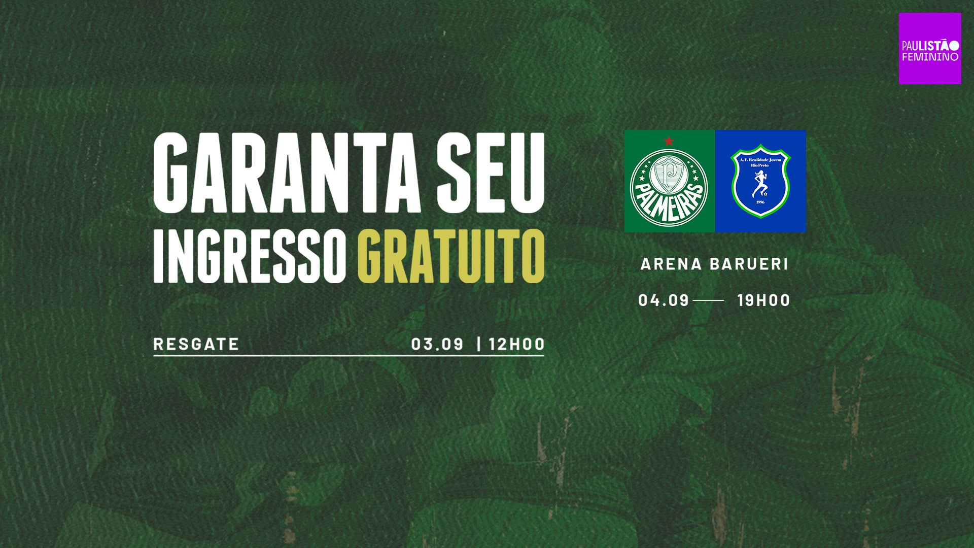 Pela oitava rodada do Campeonato Paulista Feminino, o Palmeiras recebe o Realidade Jovem, na próxima quinta-feira (4), às 19h, na Arena Crefisa Barueri. A entrada será gratuita e o resgate do ingresso poderá ser feito a partir desta quarta-feira (3), às 12h, pelo site palmeiras.soudaliga.com.br – o acesso será feito por meio de reconhecimento facial.