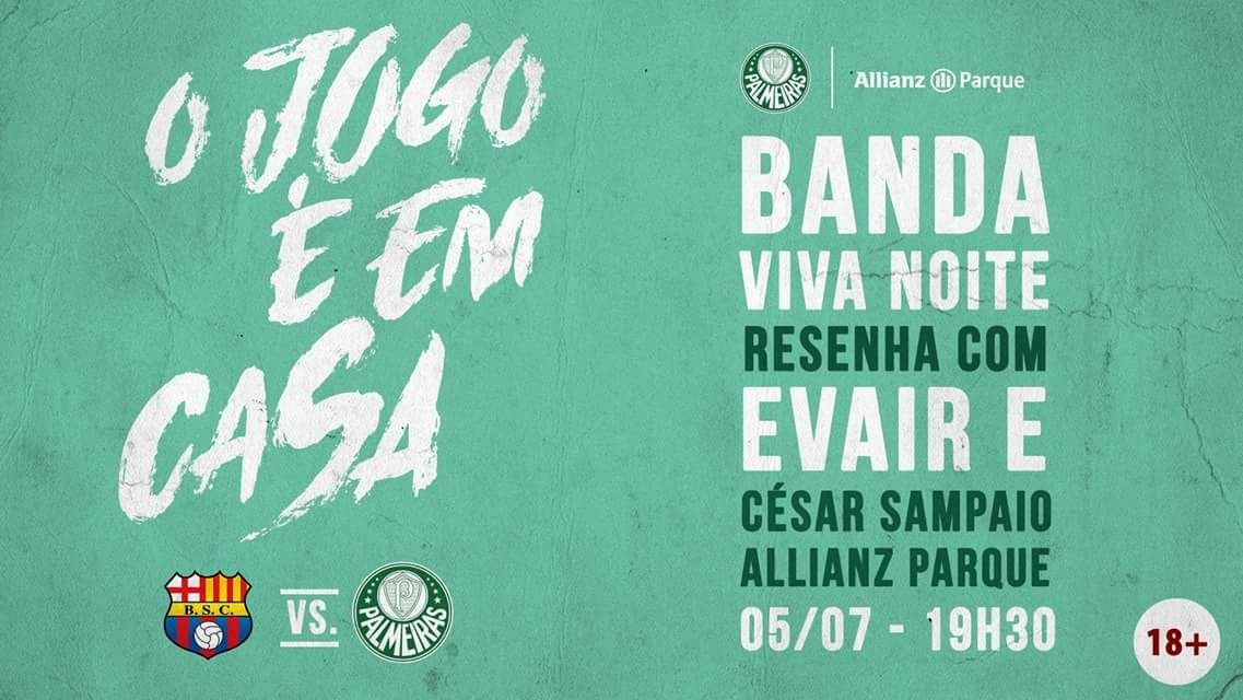 Palmeiras e Barcelona-EQU iniciam a disputa das oitavas de final da Conmebol Libertadores Bridgestone na próxima quarta-feira (05), às 21h45, no Equador. Como a torcida palestrina não poderá comparecer no estádio rival por conta de punição imposta pela Conmebol, o Verdão e o Allianz Parque, em ação conjunta, exibirão o confronto em um telão com qualidade de cinema instalado no anfiteatro da arena – o espaço inclui setor Gol Norte, Pista e Deck, todos com acesso pelo Portão B, localizado na Avenida Francisco Matarazzo. Os ídolos César Sampaio e Evair marcarão presença no evento, já a banda Viva Noite será a atração musical.