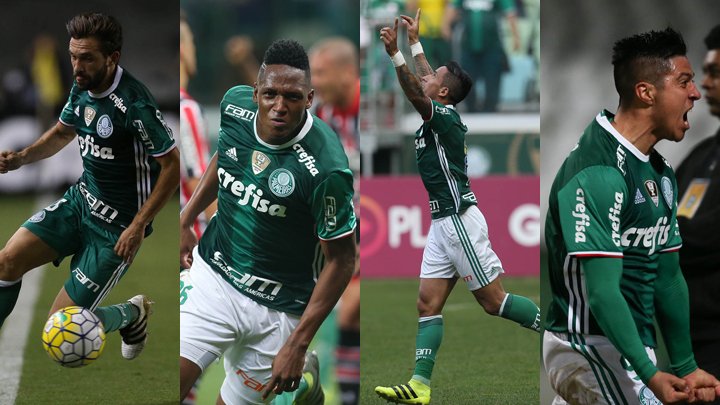 Os argentinos Allione e Cristaldo, o paraguaio Lucas Barrios e o colombiano Yerry Mina entraram para o seleto hall de jogadores estrangeiros campeões brasileiros pelo Palmeiras.