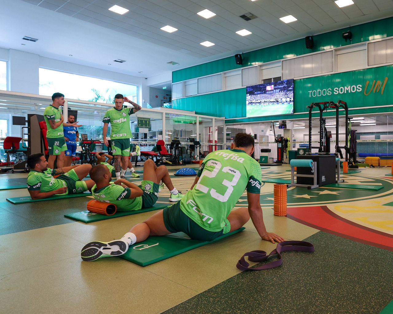 Os jogadores que foram titulares no domingo (31) fizeram recovery e assistiram lances da partida de ida contra o Santos (Foto: Fabio Menotti/Palmeiras/by Canon)