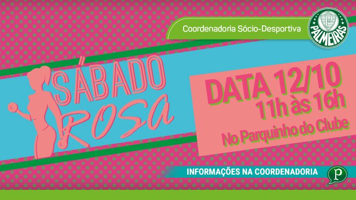 ‘Sábado Rosa’ na sede social do Palmeiras terá atividades voltadas às mulheres; confira Postado em 3 de outubro de 2016 - 17:18 por admin-plm. Departamento de Comunicação