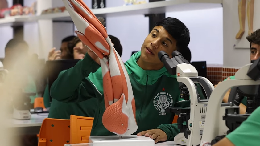 Acompanhados de assistentes sociais e pedagogos do Verdão, os atletas ouviram uma palestra de uma professora da FAM e puderam manusear peças em tamanho real de estruturas musculares e ósseas. Na imersão, os jogadores puderam compreender os processos de hipertrofia e regeneração, além de receberem informações valiosas sobre prevenção de lesões.