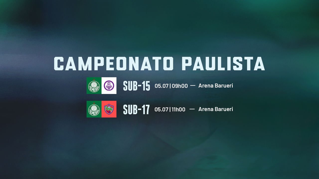 Os times Sub-15 e Sub-17 do Palmeiras entram em campo pelo Campeonato Paulista neste sábado (05), na Arena Barueri, pela segunda rodada da segunda fase. O Sub-15 duela com o Real Soccer, às 09h (de Brasília), enquanto o Sub-17 mede forças com o Pinda a partir das 11h.