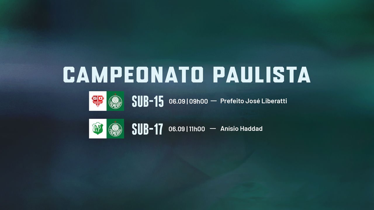 Os times Sub-15 e Sub-17 do Palmeiras entram em campo neste sábado (06), pela terceira rodada da terceira fase do Campeonato Paulista da categoria. O Sub-15 duela com o Audax, às 09h (de Brasília), no Estádio José Liberatti, em Osasco, enquanto o Sub-17 mede forças com o Rio Preto, às 11h, no Estádio Anísio Haddad, em São José do Rio Preto.