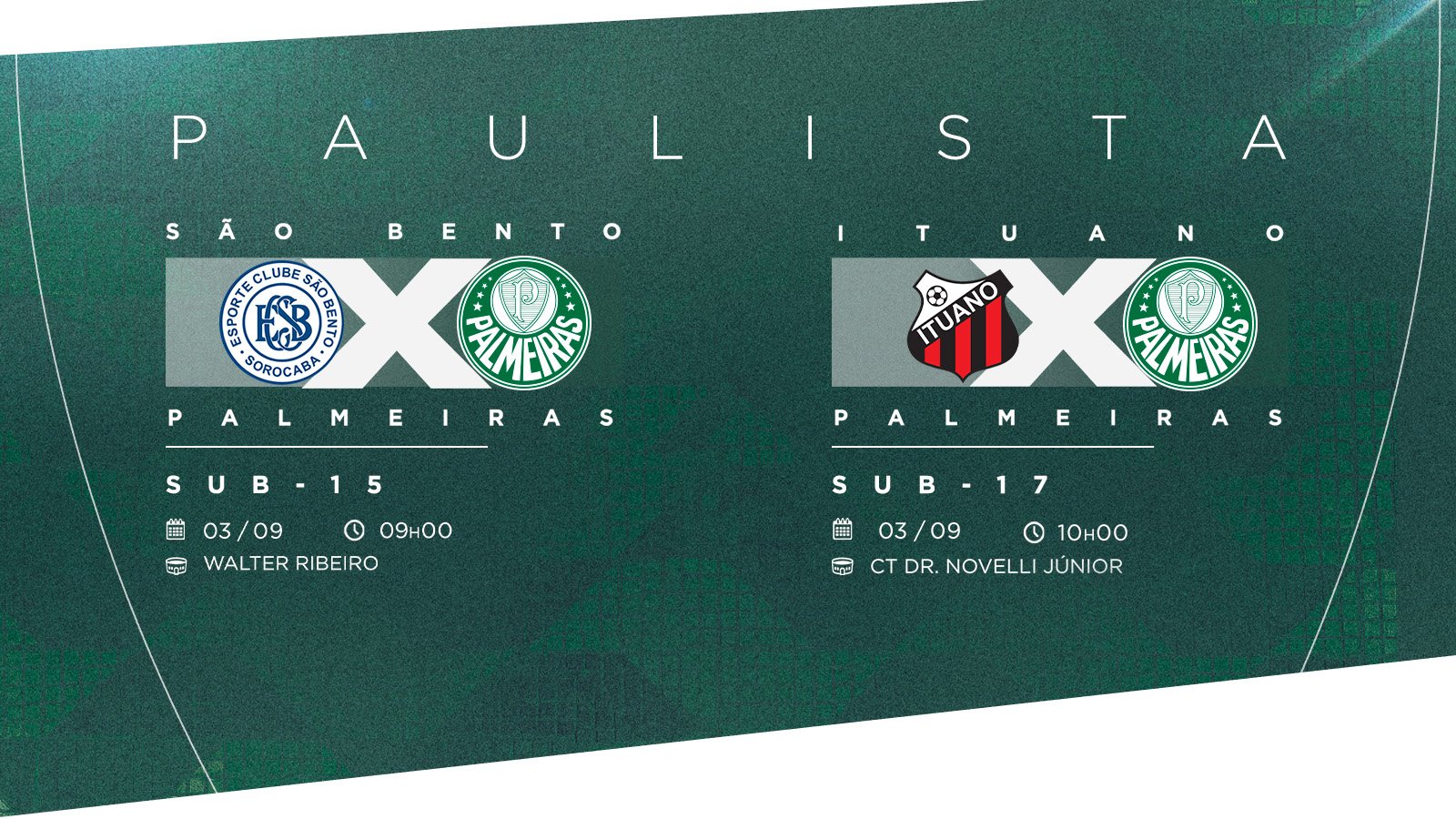 Os times Sub-15 e Sub-17 do Palmeiras entram em campo neste sábado (03), pela terceira rodada da terceira fase do Campeonato Paulista. O Sub-15 duela com o São Bento, às 9h (de Brasília), no estádio Walter Ribeiro, em Sorocaba. Em seguida, o Sub-17 mede forças com o Ituano, às 10h, no CT Dr. Novelli Júnior, em Itu.
