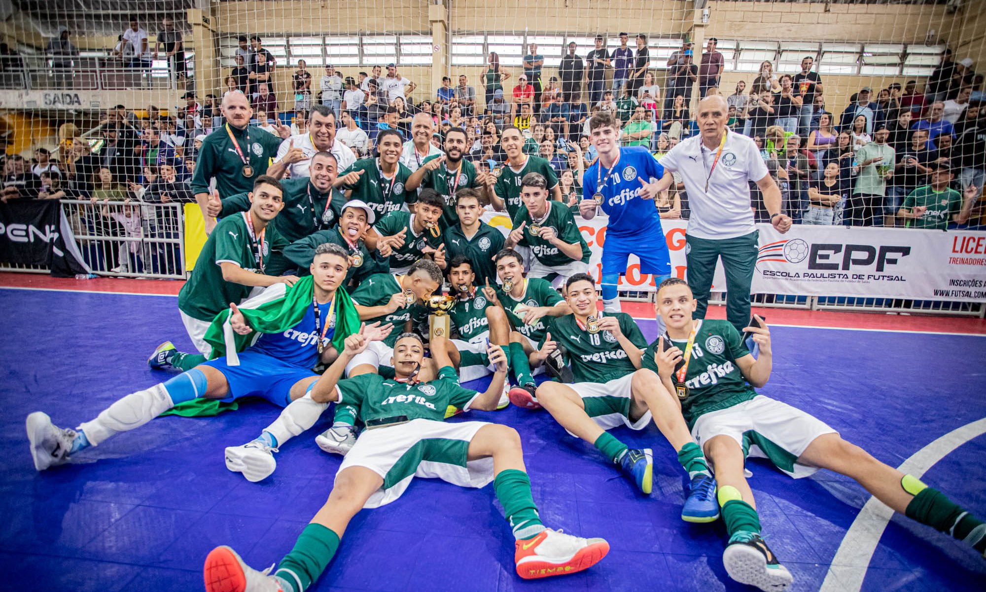É campeão! O Palmeiras conquistou, neste sábado (29), o título do Metropolitano de Futsal nas categorias Sub-16 e Sub-18 ao vencer o Corinthians na final do torneio, disputado no Ginásio Presidente Ciro II, na Penha, em São Paulo-SP.