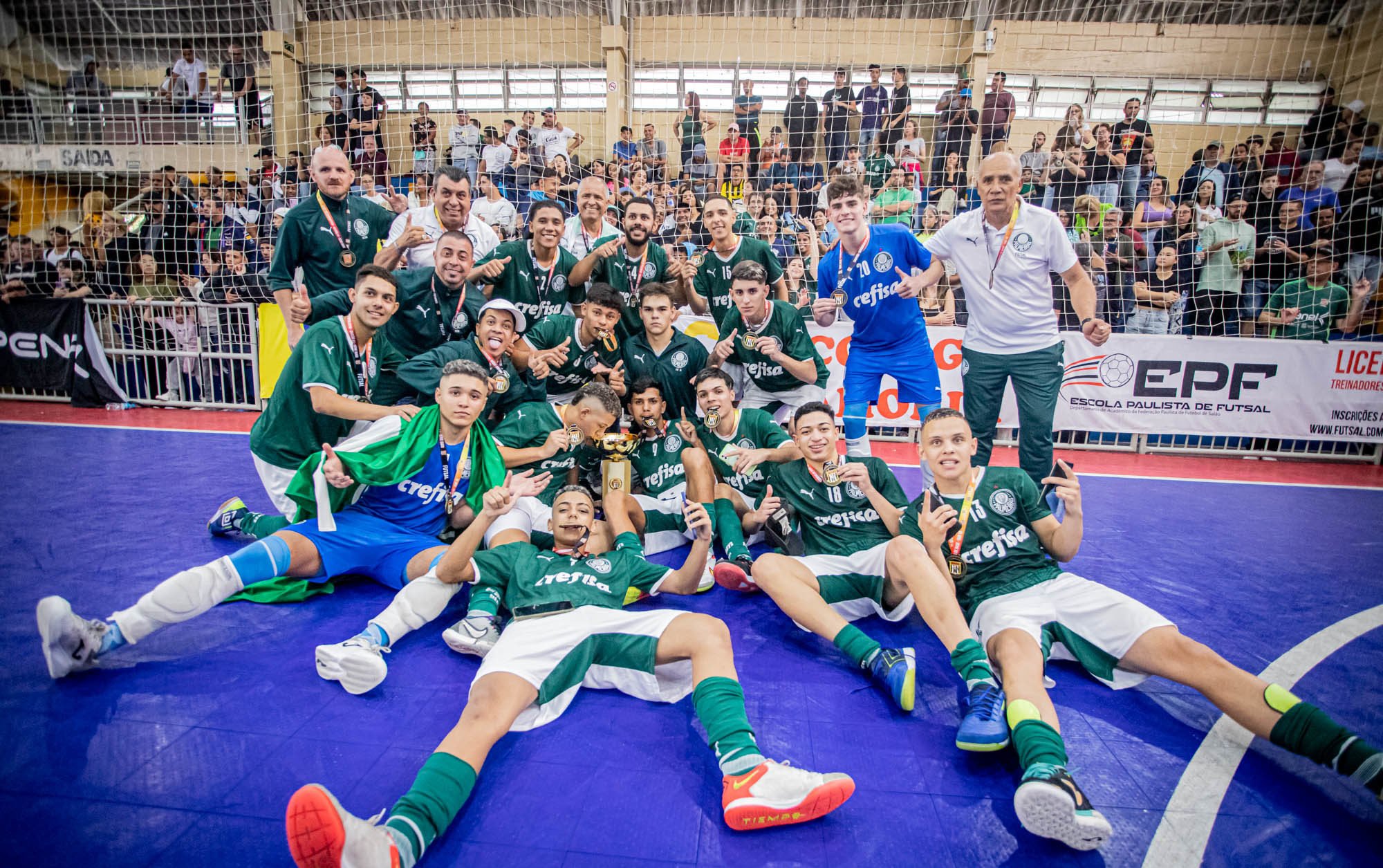 É campeão! O Palmeiras conquistou, neste sábado (29), o título do Metropolitano de Futsal nas categorias Sub-16 e Sub-18 ao vencer o Corinthians na final do torneio, disputado no Ginásio Presidente Ciro II, na Penha, em São Paulo-SP.