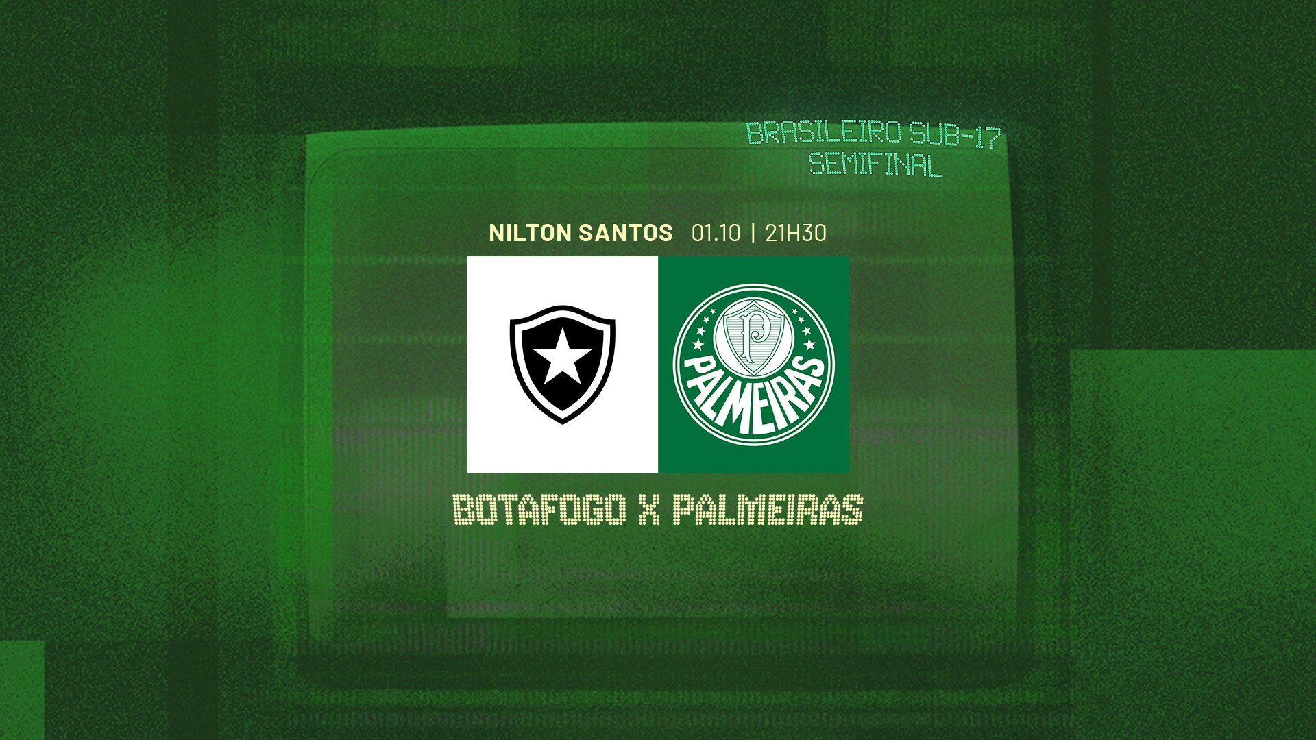 O time Sub-17 do Palmeiras terá pela frente o Botafogo, nesta terça-feira (01), às 21h30 (de Brasília), no Estádio Nilton Santos, no Rio de Janeiro-RJ, na partida de ida da semifinal do Campeonato Brasileiro da categoria. O confronto terá transmissão do SporTV.