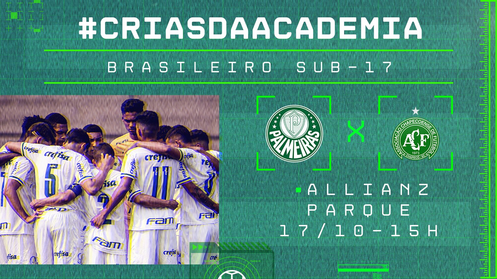 A equipe Sub-17 do Palmeiras enfrenta a Chapecoense neste sábado (17), às 15h, no Allianz Parque, pela terceira rodada da primeira fase do Campeonato Brasileiro da categoria. O duelo será exibido pela CBF TV (MyCujoo) e também será disponibilizado na página inicial do site do Palmeiras.
