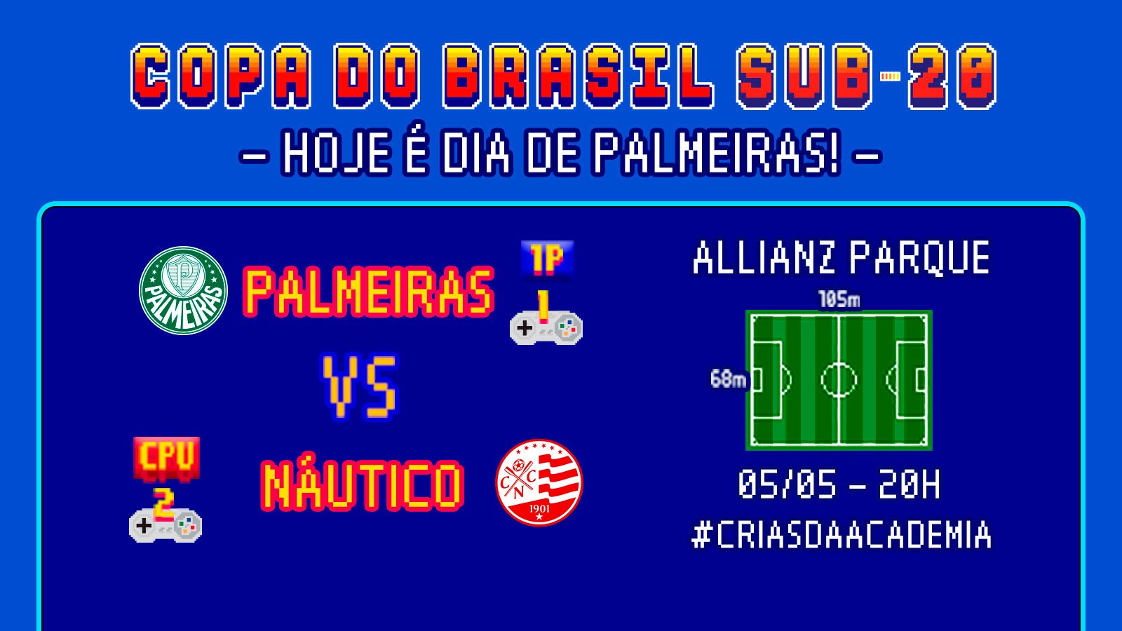 Após 54 dias sem jogar por conta da paralisação dos torneios de base no país, o Palmeiras retoma o calendário da temporada nesta quarta-feira (05), às 20h, contra o Náutico, no Allianz Parque, pelo duelo de ida das oitavas de final da Copa do Brasil Sub-20. O duelo será transmitido pela CBF TV (MyCujoo) e exibido na home do Site Oficial do Verdão.