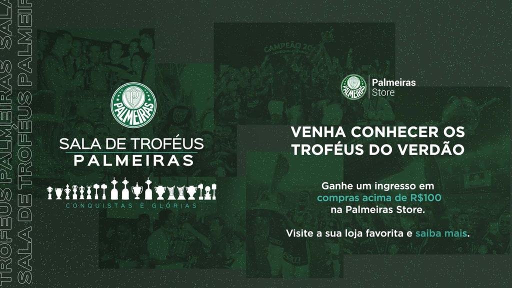 Neste sábado (11) e domingo (12), os torcedores que fizerem compras acima de R$ 100,00 na PalmeirasStore.com e lojas físicas da rede ganharão dois ingressos para visitar a Sala de Troféus do Palmeiras, no Allianz Parque.