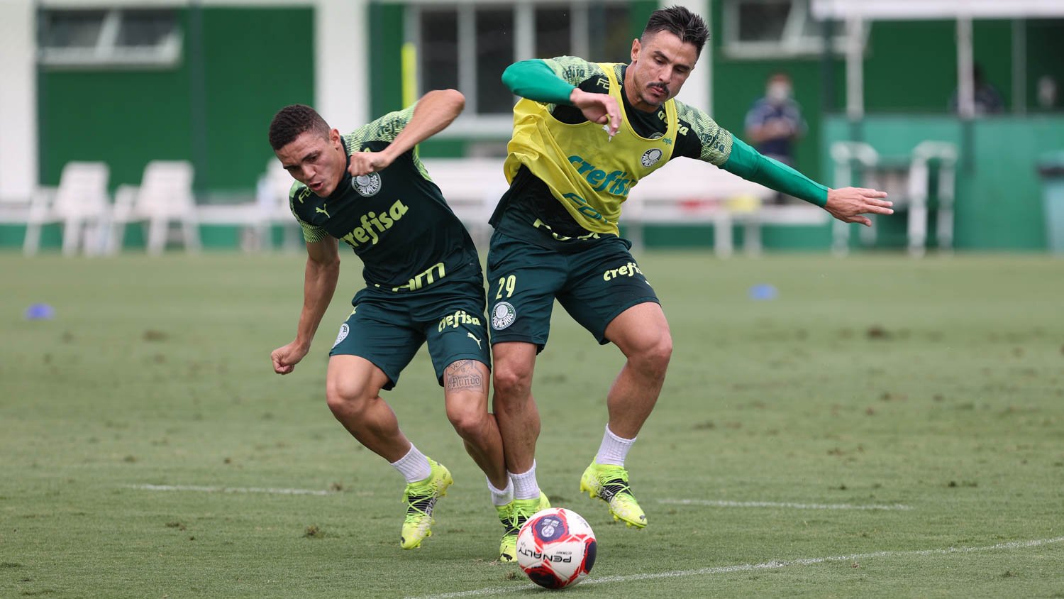 Os jogadores Marcelinho e Willian (à direita) durante treinamento na Academia de Futebol (Foto: Cesar Greco/Palmeiras)
