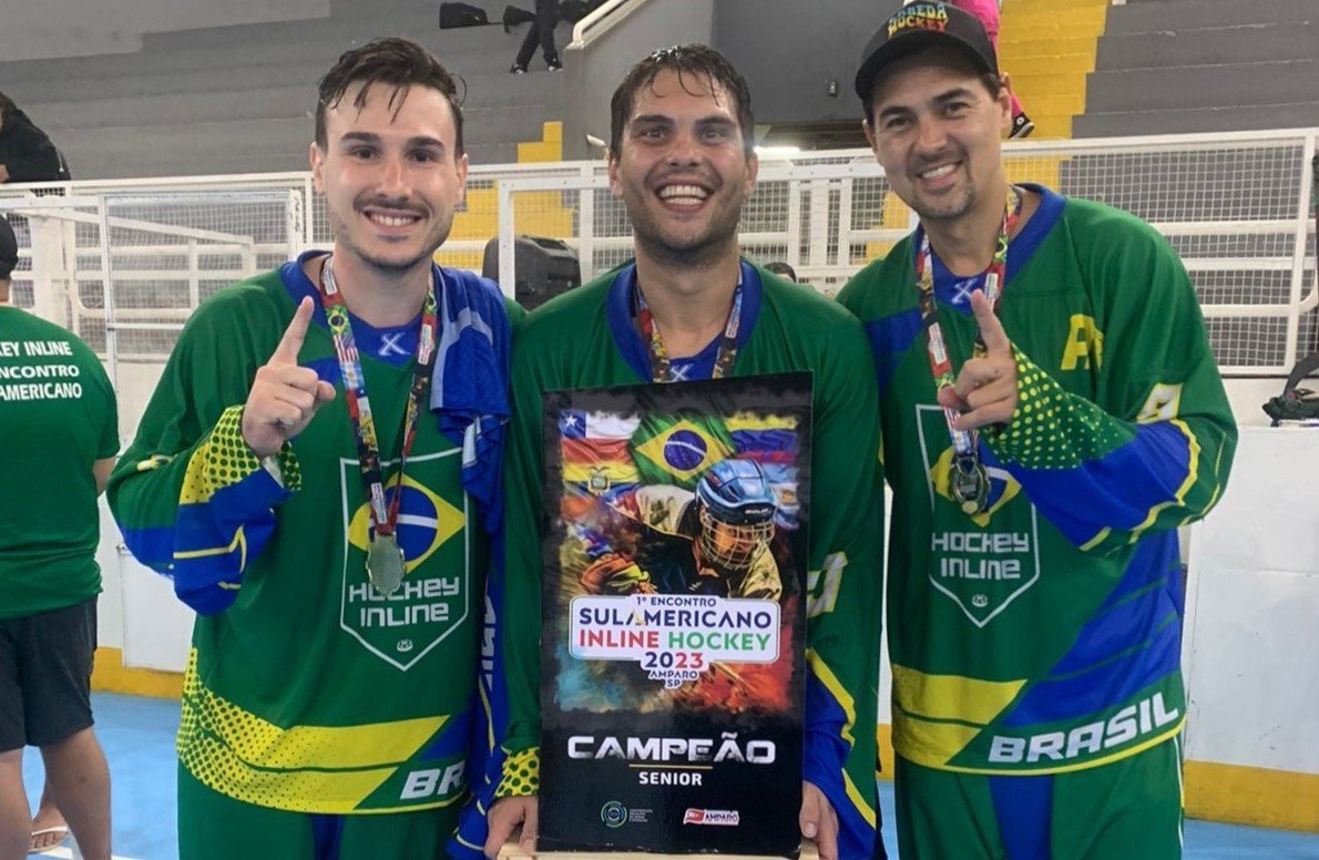 O goleiro Leonardo Acquesta e os avançados Marlon Scatolin e Rogerio Watanabe (Japa) foram campeões, no último domingo (19), do 1° Encontro Sul-Americano de Hóquei In Line com a Seleção Brasileira, no Centro Esportivo do Trabalhador, em Amparo (SP).