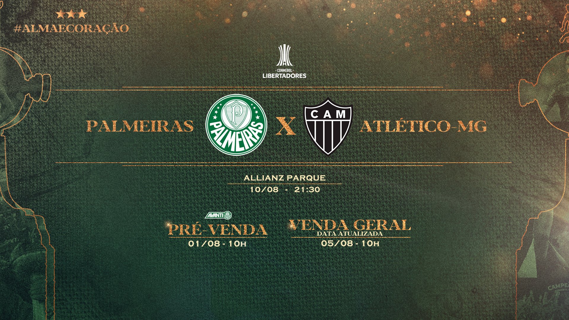 Os ingressos para o duelo com o Atlético-MG, que ocorrerá na quarta-feira (10), às 21h30, no Allianz Parque, pela partida de volta das quartas de final da CONMEBOL Libertadores, estão à venda para todos os torcedores por meio do site www.ingressospalmeiras.com.br.