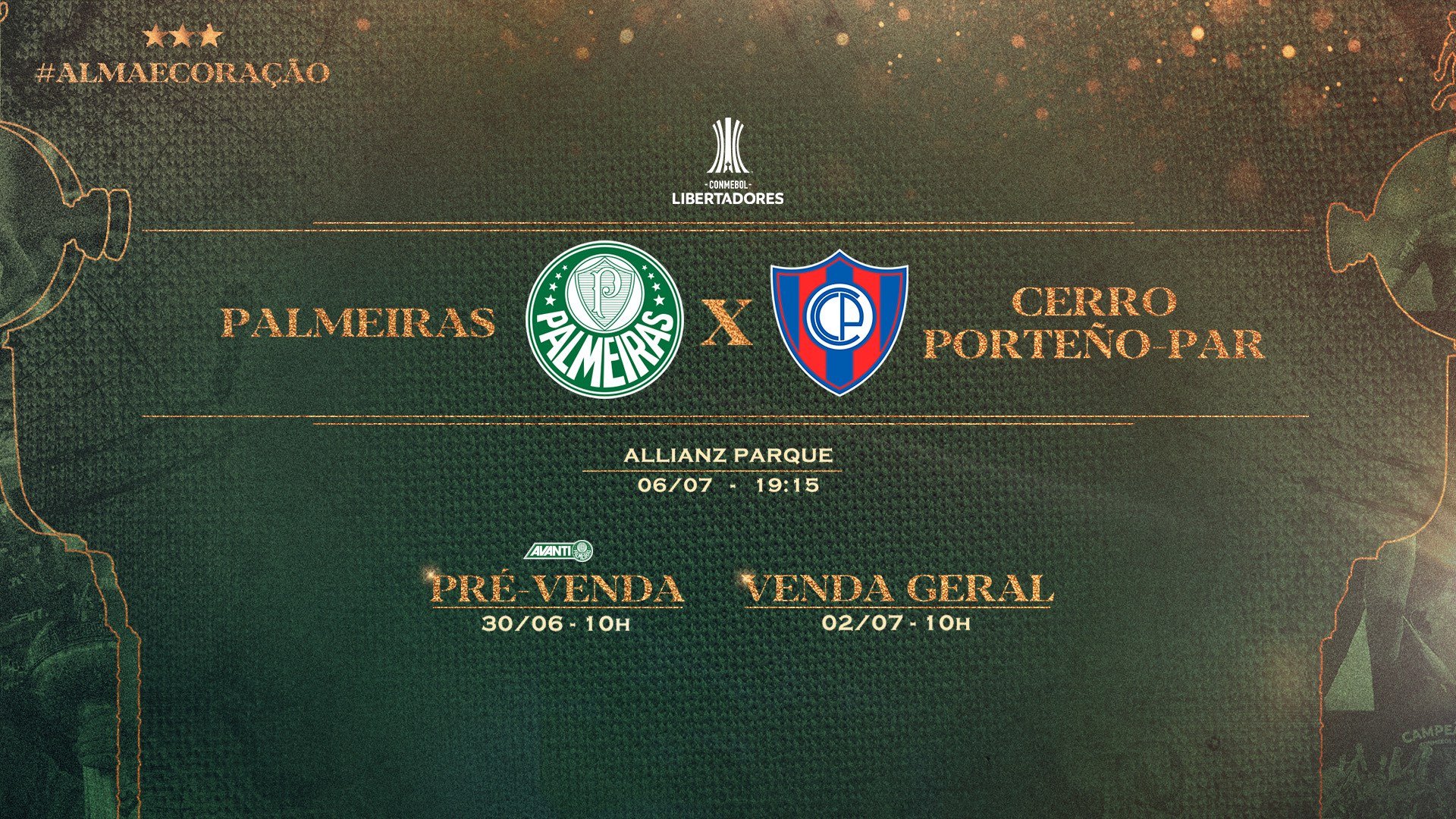Os ingressos para o duelo com o Cerro Porteño-PAR, que ocorrerá na quarta-feira (06), às 19h15, no Allianz Parque, pela partida de volta das oitavas de final da CONMEBOL Libertadores, estão à venda para todos os torcedores por meio do site www.ingressospalmeiras.com.br.