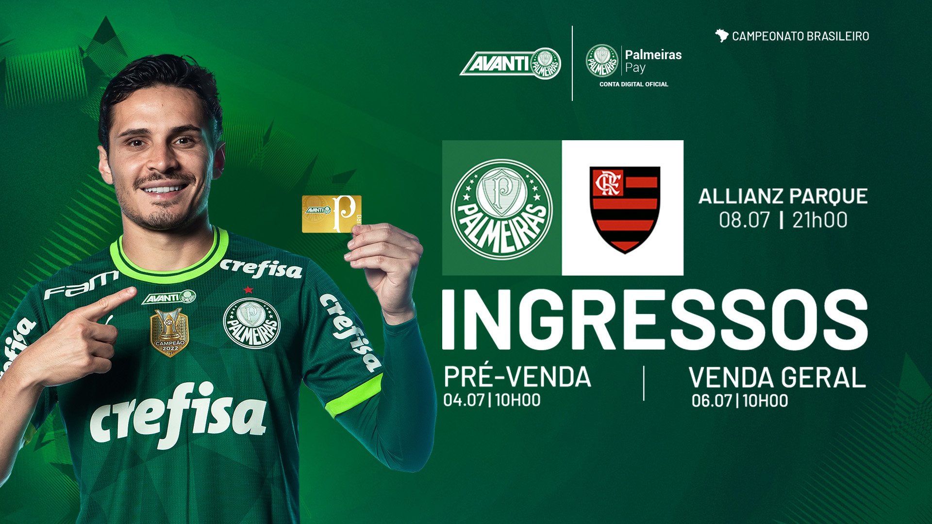 Os ingressos para o jogo contra o Flamengo, que ocorrerá no sábado (08), às 21h, no Allianz Parque, pela 14ª rodada do Campeonato Brasileiro, estão à venda para todos os torcedores por meio do site www.ingressospalmeiras.com.br.