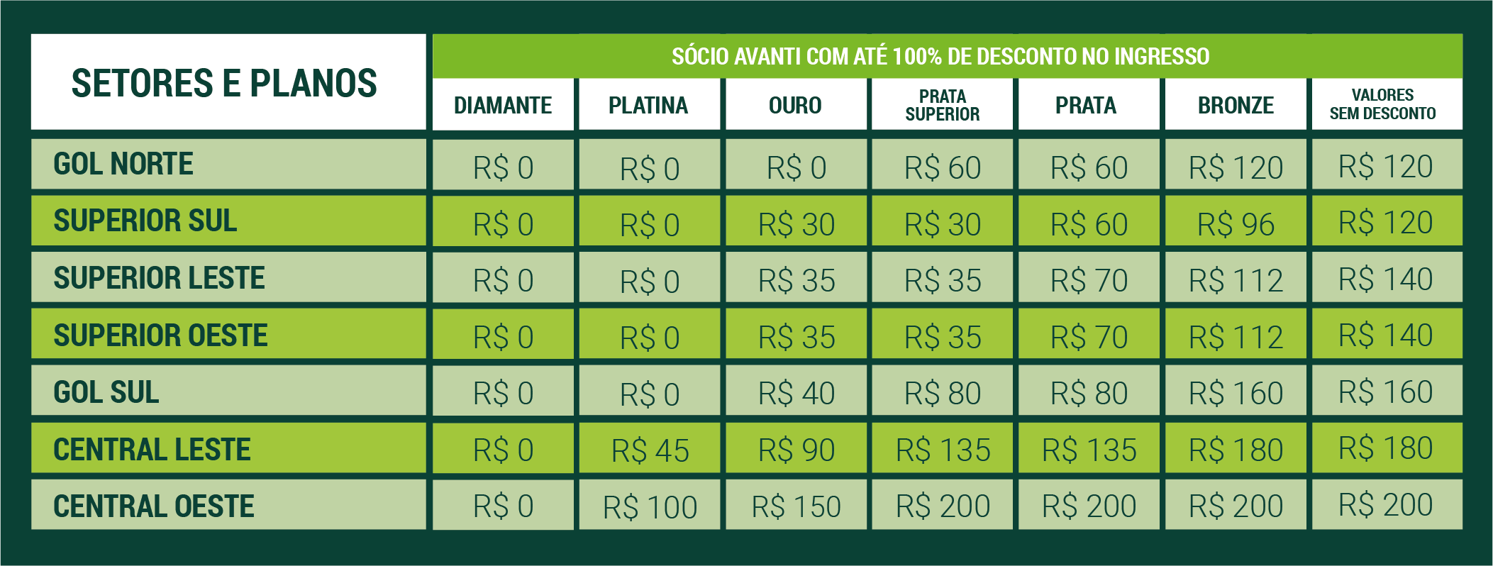 Torcedores que não fazem parte do Programa Avanti podem comprar os seus ingressos com os seguintes preços: