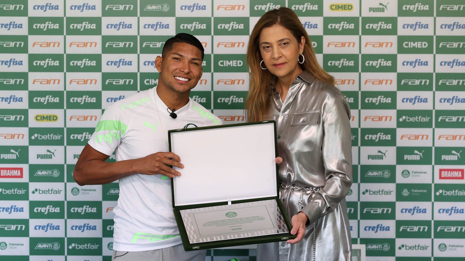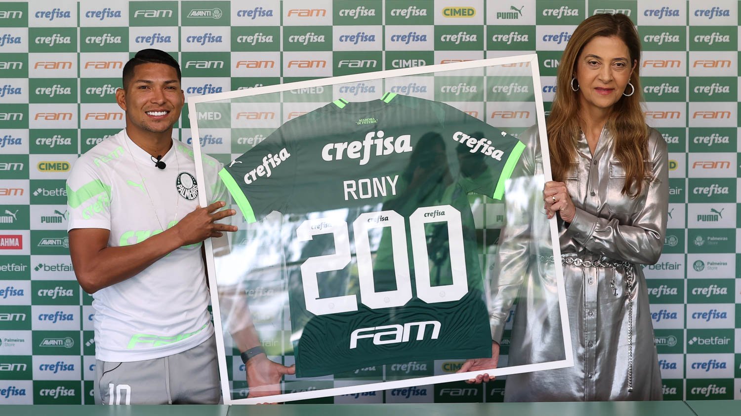 O atacante Rony recebeu das mãos da presidente Leila Pereira uma placa e uma camisa em alusão aos 200 duelos do camisa 10 alviverde, marca alcançada contra o Atlético-MG, na última quarta-feira (09), pela CONMEBOL Libertadores. Leila valorizou a entrega do Rústico em campo e seus feitos como, por exemplo, ser o maior artilheiro do clube na história da competição continental, com 20 gols.