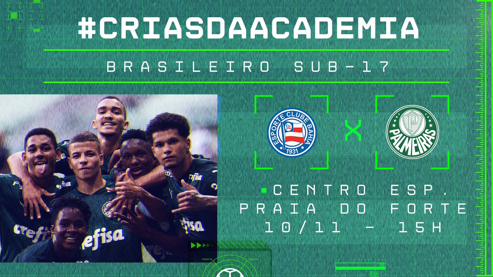 O time Sub-17 do Palmeiras encerra sua participação na primeira fase do Campeonato Brasileiro da categoria contra o Bahia nesta terça-feira (10), às 15h, no Centro Esportivo Praia do Forte, em Mata de São João-BA. O duelo será transmitido pela CBF TV (MyCujoo) e exibido pelo site oficial do Verdão.