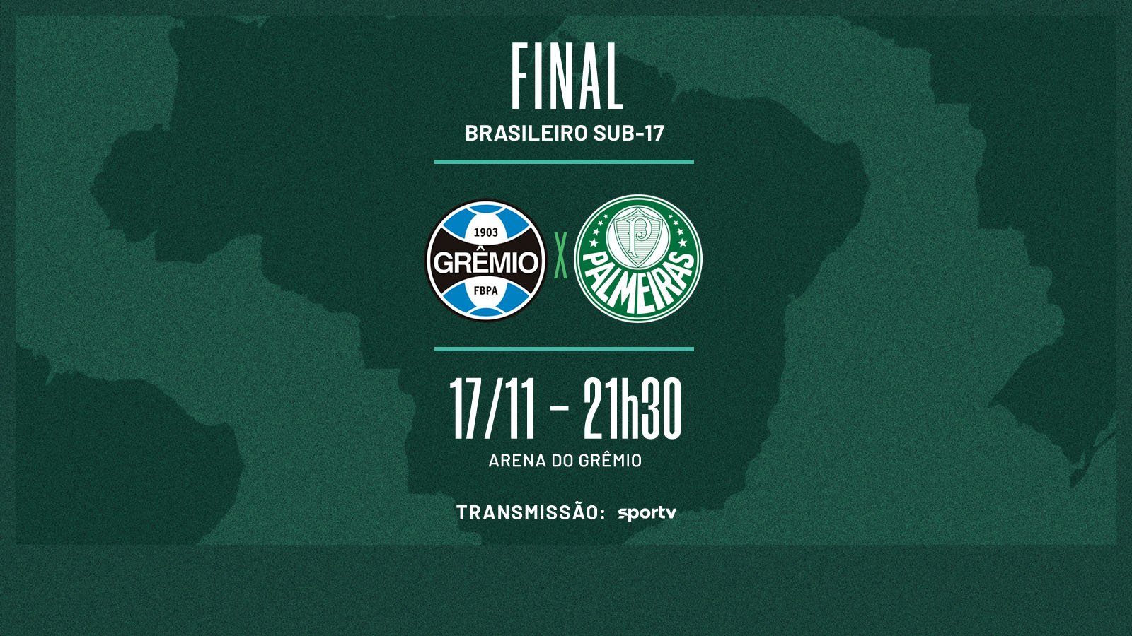O time Sub-17 do Palmeiras terá pela frente o Grêmio, nesta quinta-feira (17), às 21h30 (de Brasília), na partida única da final do Campeonato Brasileiro da categoria. O jogo, que será realizado na Arena do Grêmio, terá transmissão do SporTV.
