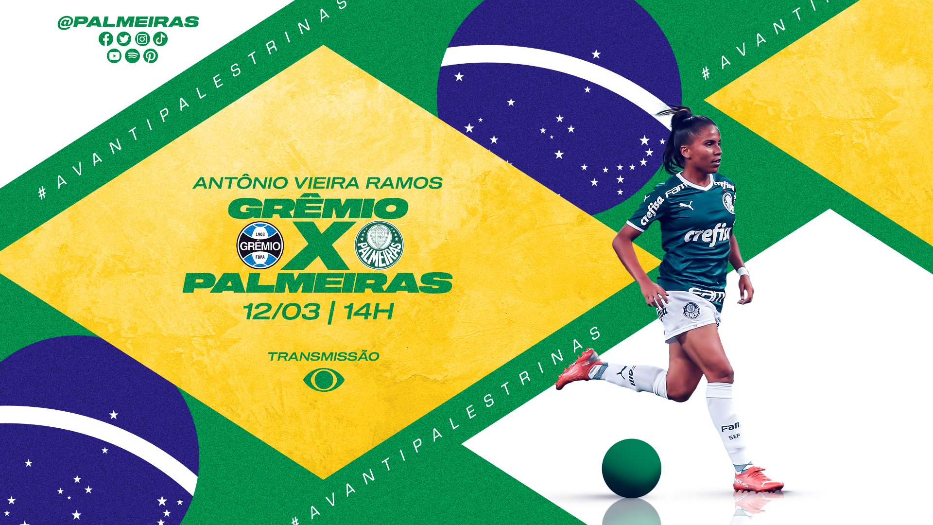 O Verdão vai encarar o Grêmio na tarde deste sábado (12), às 14h, pela segunda rodada do Brasileirão Feminino, no Estádio do Vieirão, em Gravataí-RS. A partida será transmitida ao vivo pela TV Bandeirantes.