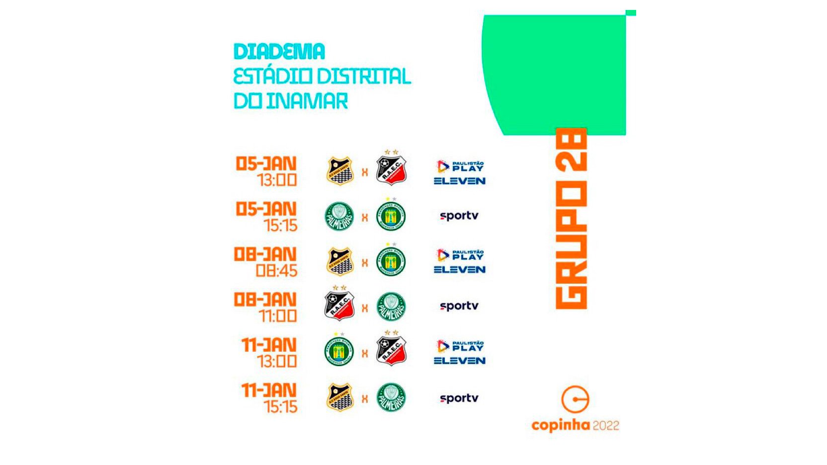 As Crias da Academia farão a primeira fase da competição na cidade de Diadema, localizada a 23km da capital paulista. Além do ASSU-RN, os adversários do Verdão no Grupo 28 serão Água Santa e Real Ariquemes, de Rondônia (confira abaixo a arte com a tabela completa).