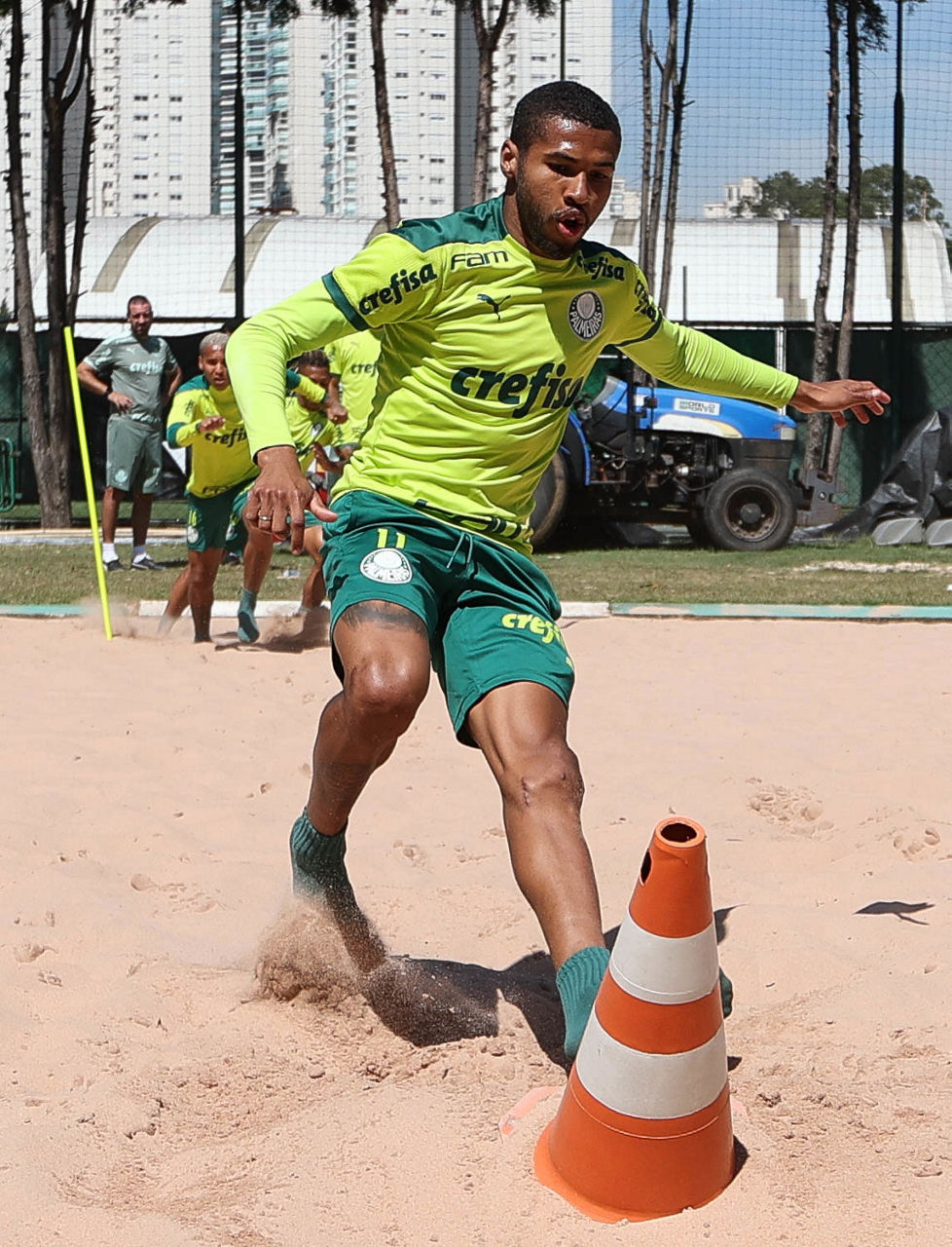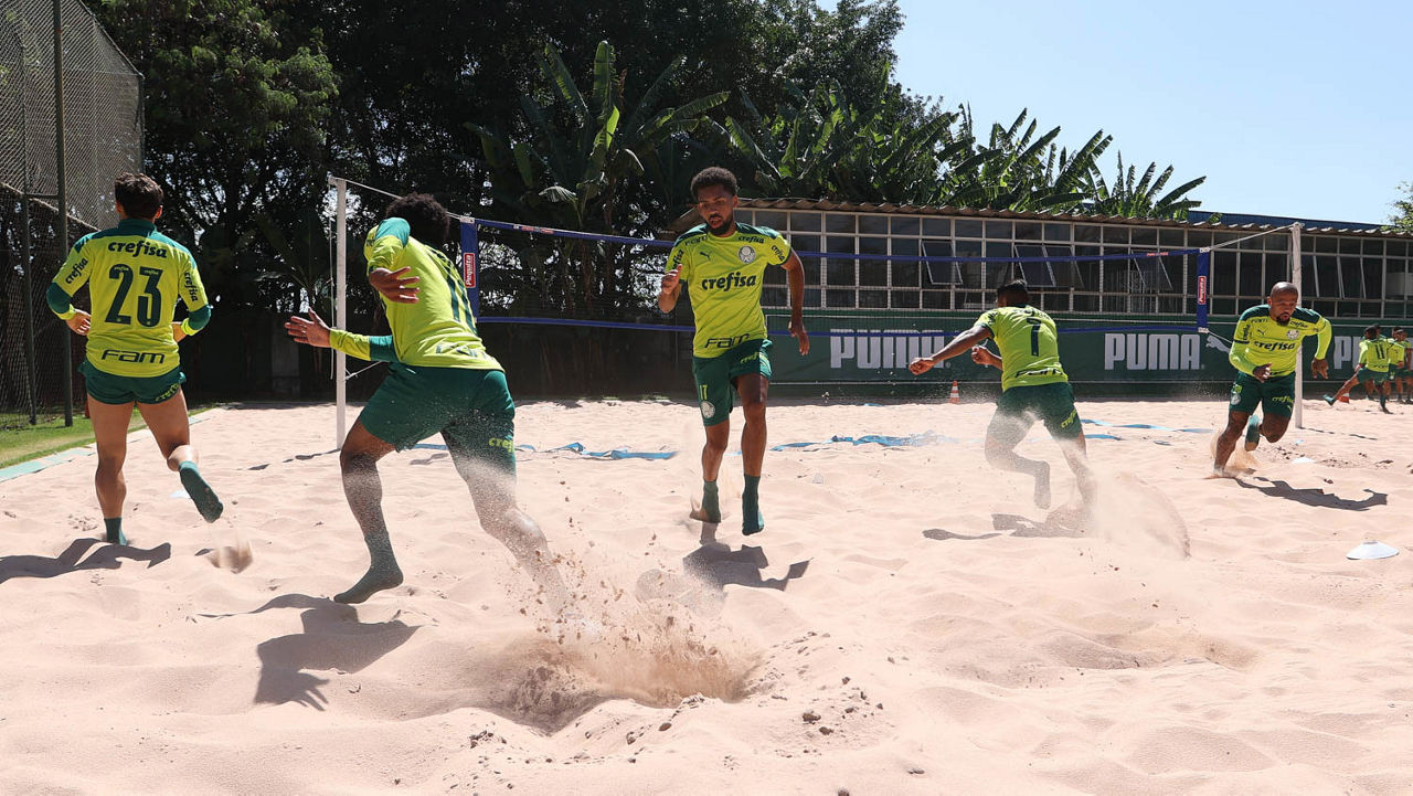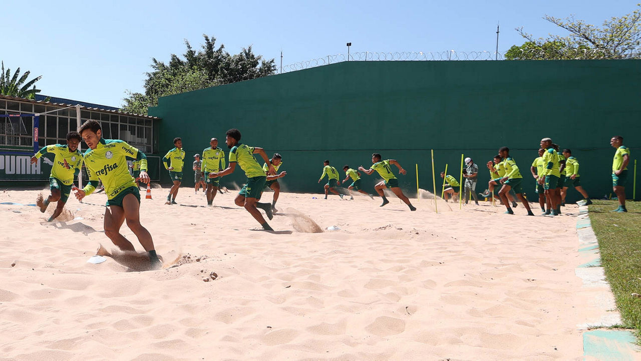 O dia começou diferente, com a visita de jogadores e comissão à Sala de Troféus do Palmeiras, instalada no primeiro piso do Allianz Parque e inaugurada no 107º aniversário do clube. Na sequência, já no centro de treinamento alviverde, os atletas passaram por um circuito de ativação física e trabalhos de força na caixa de areia com cinco estações diferentes.