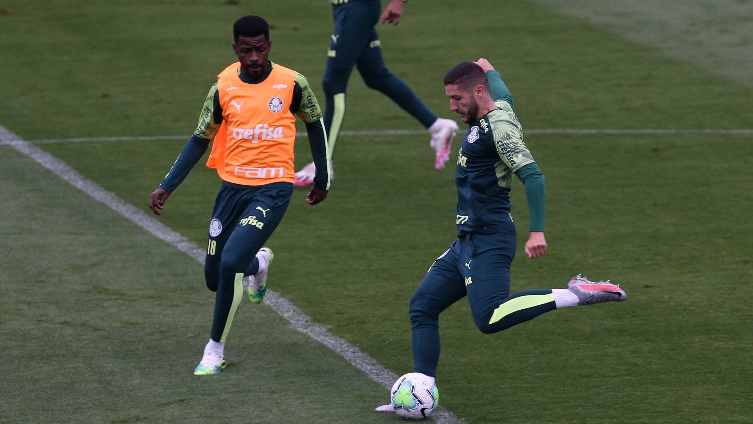 Os jogadores Zé Rafael, Vitor Hugo e Iván Angulo (da esquerda para a direita) durante treinamento na Academia de Futebol (Cesar Greco/Palmeiras)