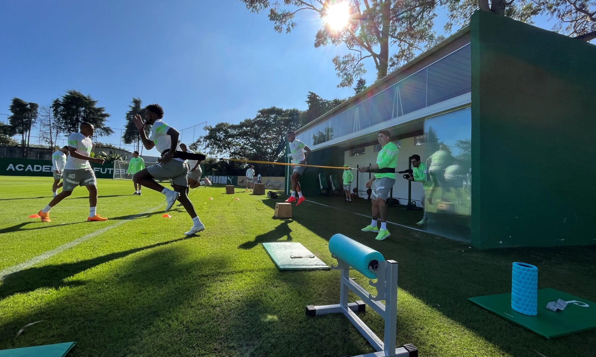 Os jogadores realizaram a ativação muscular pré-treino no novo espaço externo, anexo ao Campo 2, inaugurado no último mês. Nesse local, sob orientação dos preparadores físicos, o atleta é estimulado no piso de treinamento e já calçando as chuteiras, o que possibilita uma melhor transferência das ações específicas para o campo.