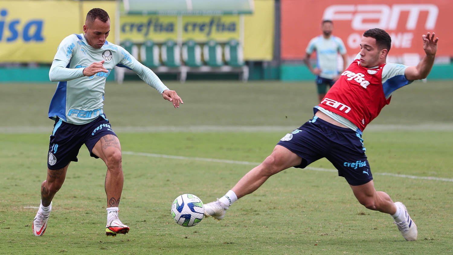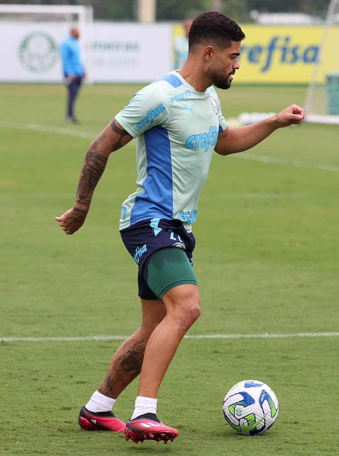 Antes do início do trabalho, o Verdão inaugurou um novo espaço externo, anexo ao Campo 2, com pesos livres para a ativação muscular pré-treino. Nesse local, sob orientação dos preparadores físicos, o atleta é estimulado no piso de treinamento e já calçando chuteiras, o que possibilita uma melhor transferência das ações específicas para o campo.