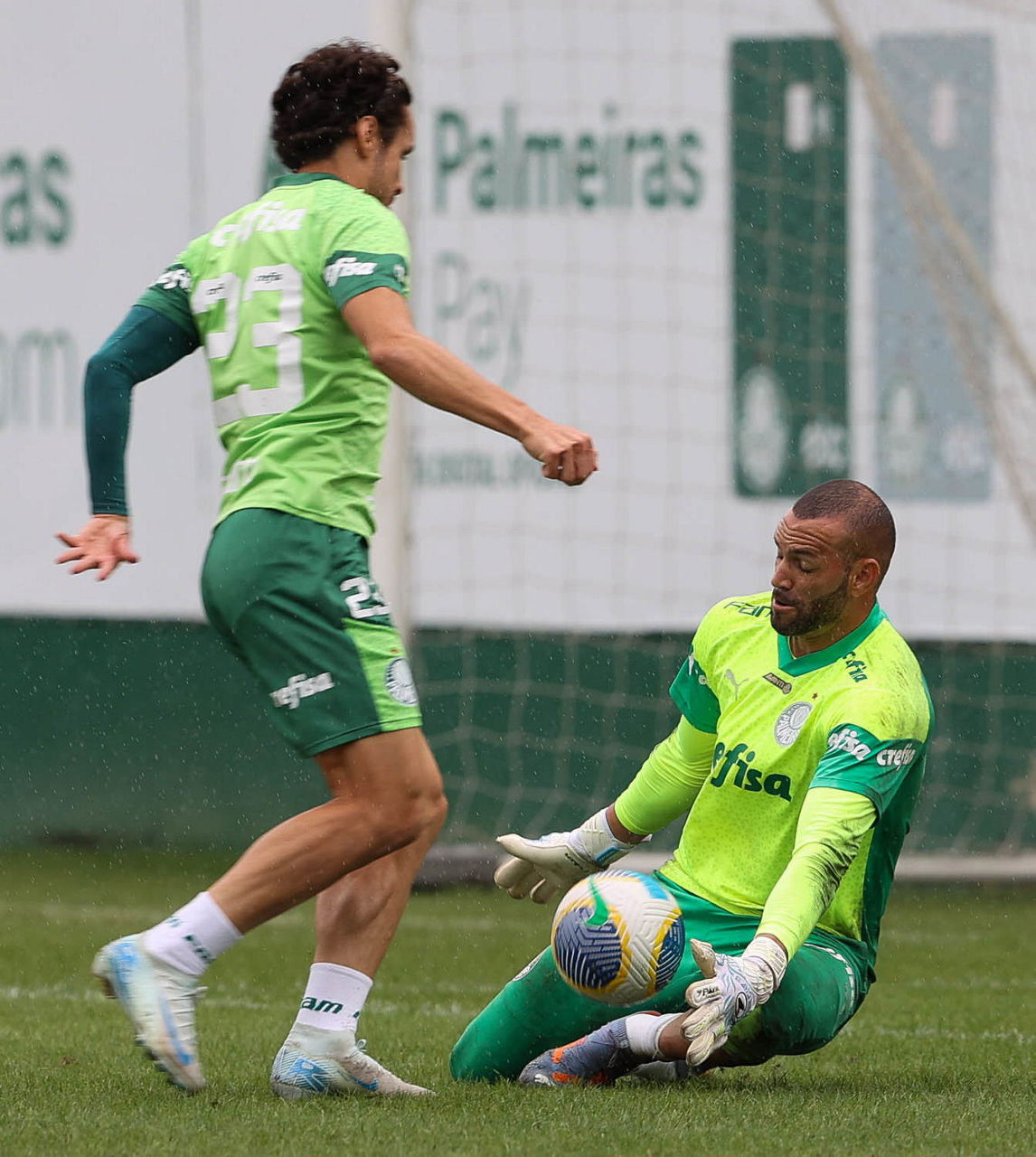 Os jogadores Richard Ríos e Naves (à direita) durante treinamento na Academia de Futebol (Foto: Cesar Greco/Palmeiras/by Canon)