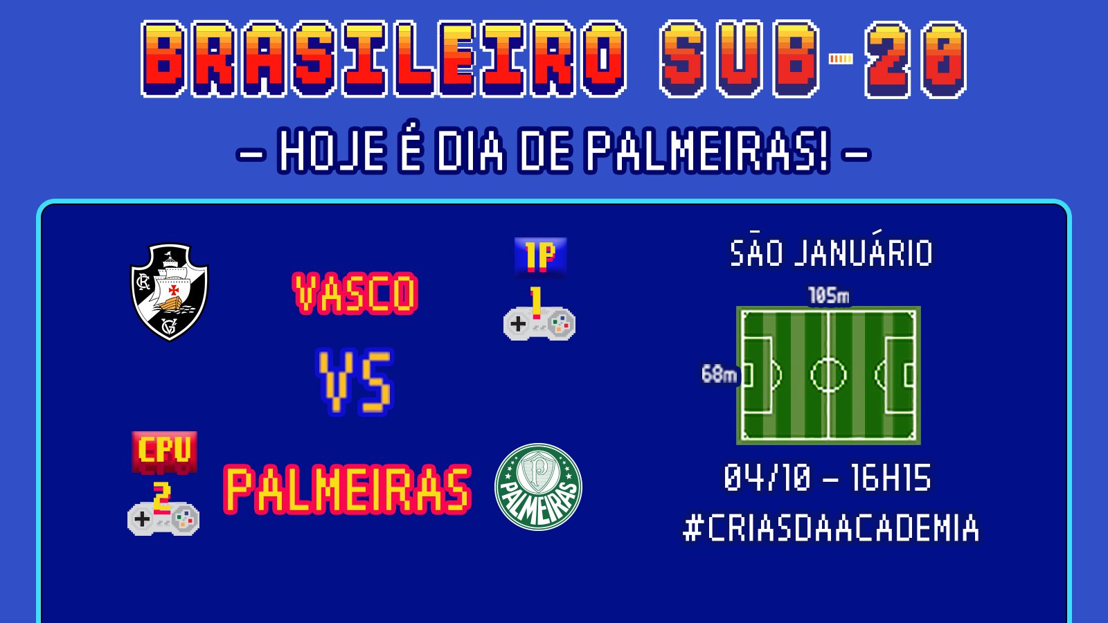 A equipe Sub-20 do Palmeiras encara o Vasco nesta segunda-feira (04), às 16h15, em São Januário, pela 18ª rodada da primeira fase do Campeonato Brasileiro da categoria. O duelo será transmitido pelo SporTV.