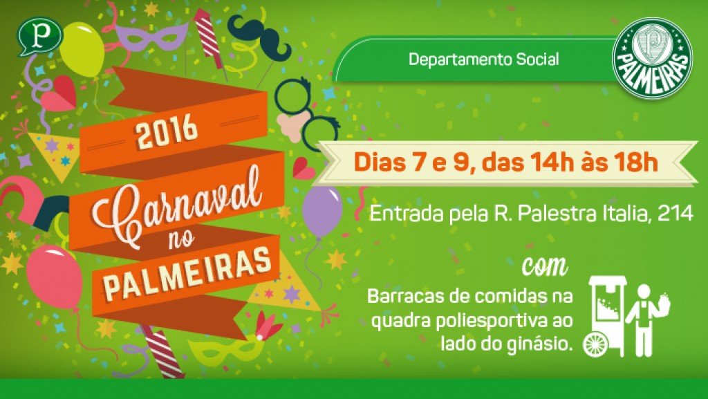 A Sociedade Esportiva Palmeiras abre as portas de sua sede para associados e convidados curtirem o Carnaval nas dependências do clube. Os palmeirenses podem aproveitar a folia entre os dias 7 e 9 de fevereiro, das 14 às 18h, com entrada pela portaria da Rua Palestra Italia, 214.