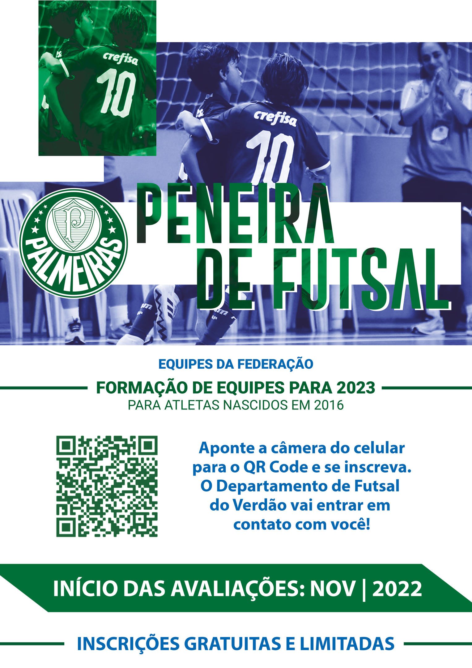 O Palmeiras iniciou neste sábado (22) as inscrições para a seletiva de futsal da temporada de 2023. A peneira é destinada para atletas da categoria Sub-6 (nascidos em 2016) e, para participar, basta clicar aqui e preencher o formulário.