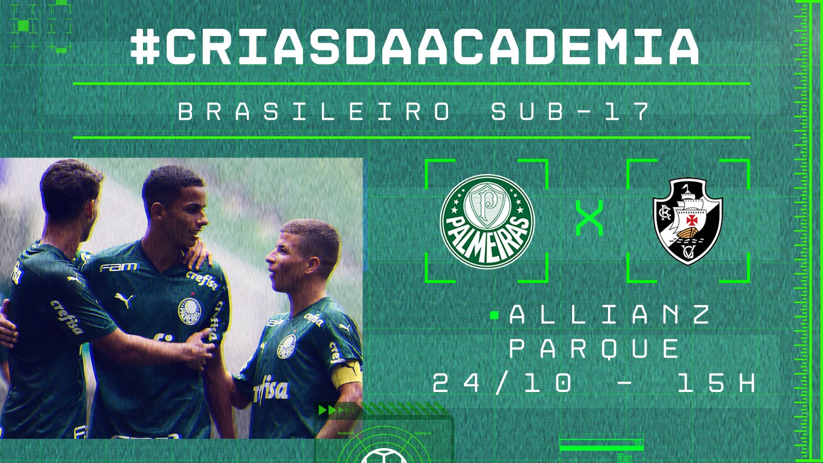 A equipe Sub-17 do Palmeiras mede forças com o Vasco neste sábado (24), às 15h, no Allianz Parque, pela quarta rodada da primeira fase do Campeonato Brasileiro da categoria. O duelo será transmitido pela CBF TV (MyCujoo) e será exibido na home do site oficial do Verdão.
