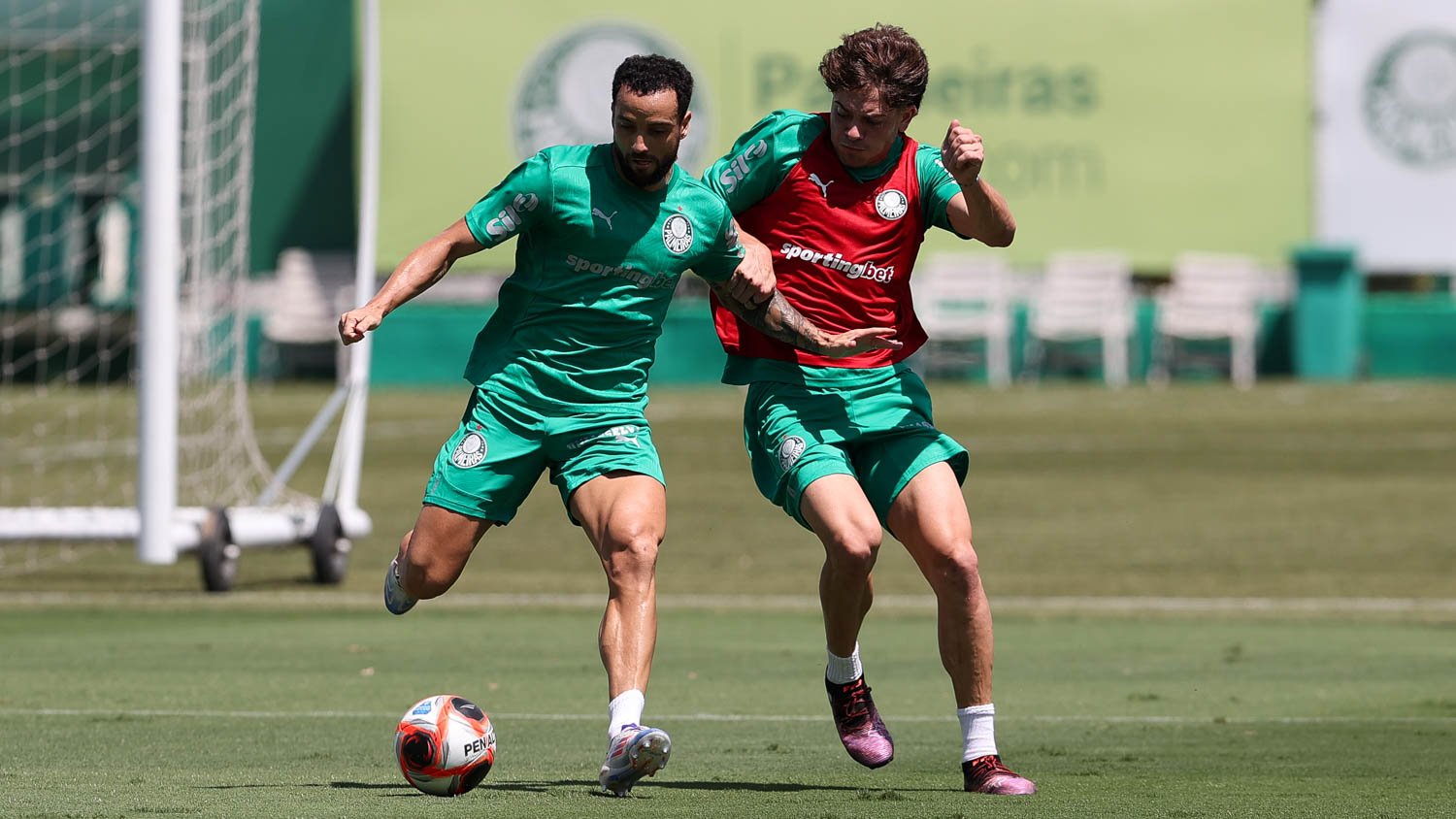 Vitor Roque (à esquerda) fez seu primeiro treino no gramado com o grupo (Foto: Cesar Greco/Palmeiras/by Canon)