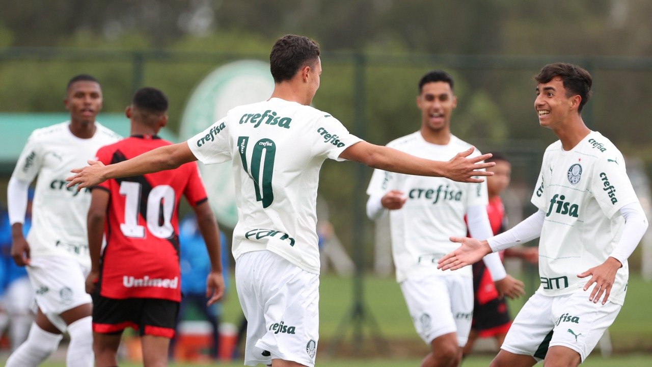 O time Sub-17 do Palmeiras derrotou o Atlético-GO por 4 a 1, nesta quinta-feira (29), na Academia de Futebol 2, em Guarulhos, e garantiu vaga nas quartas de final do Campeonato Brasileiro. Os gols das Crias da Academia no jogo válido pela última rodada da fase inicial foram marcados por Thalys e Estêvão, duas vezes cada.