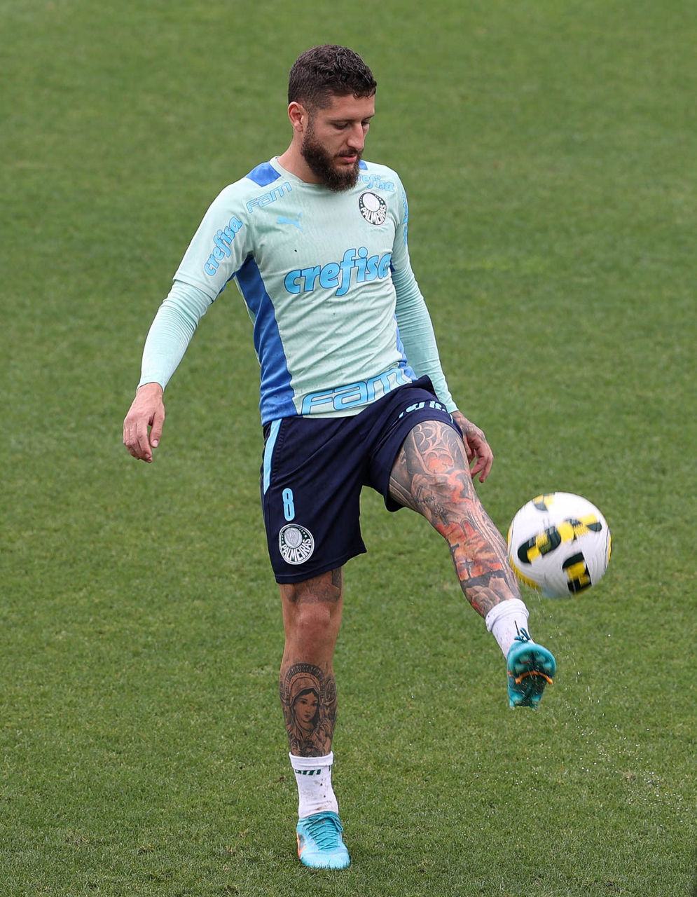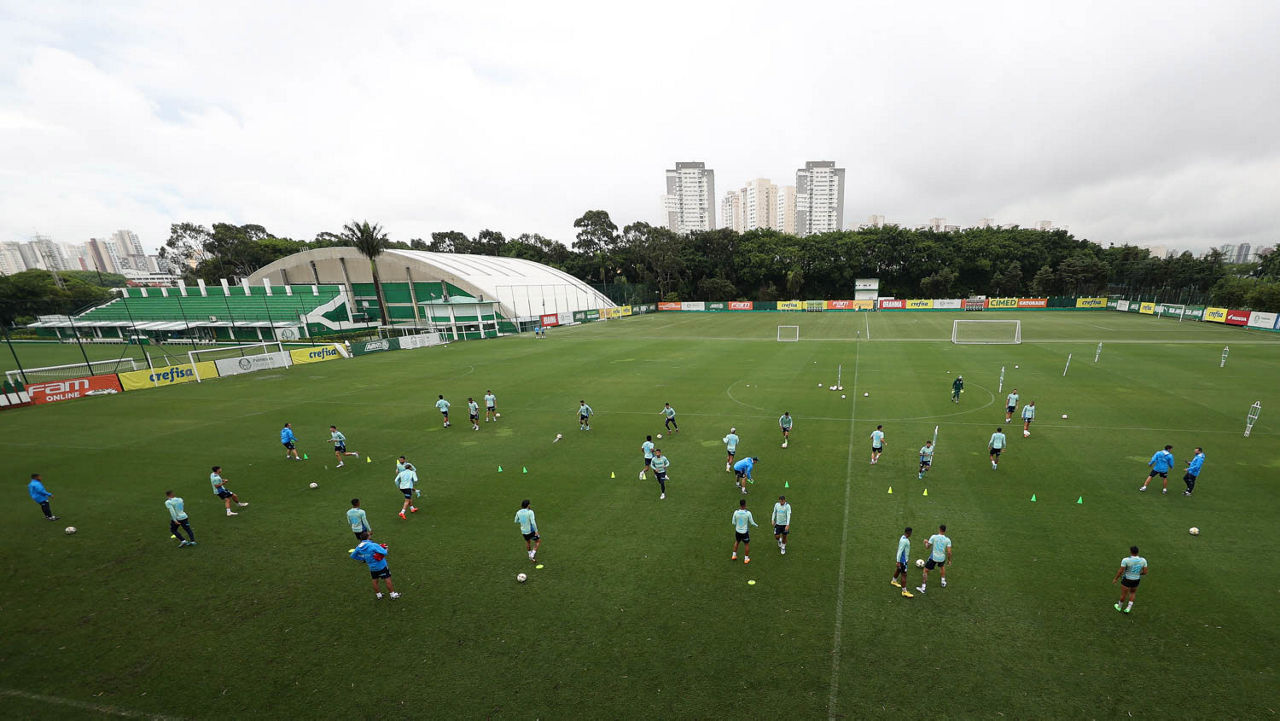 Em uma atividade tática posicional, o técnico Abel Ferreira dividiu o grupo em dois times que trabalharam balanço e construção de jogadas, entre outros aspectos. Depois, as mesmas equipes fizeram um enfrentamento em campo reduzido.