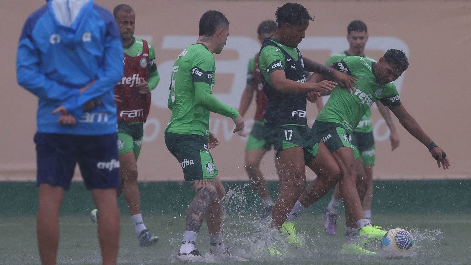 O Palmeiras treinou na tarde desta quarta-feira (06), na Academia de Futebol, em mais um dia de preparação antes de enfrentar o Grêmio, às 21h30 da sexta-feira (08), no Allianz Parque, pela 33ª rodada do Campeonato Brasileiro. Sob forte chuva, o elenco realizou um trabalho de posse de bola em campo reduzido com objetivos traçados pela comissão.
