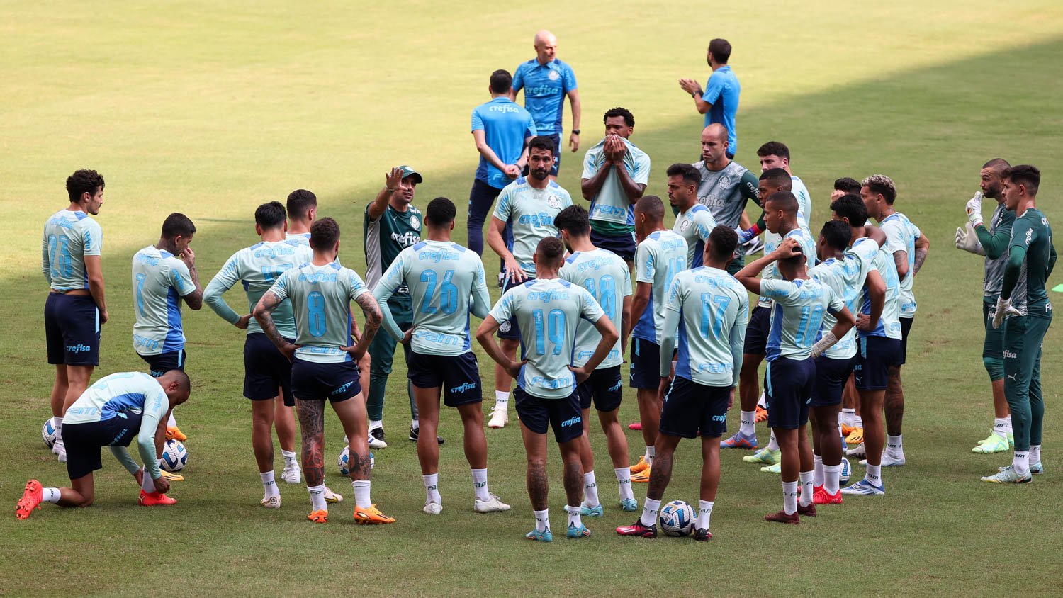 O técnico Abel Ferreira conversa com o elenco durante treinamento no estádio do Emelec (Foto: Cesar Greco/Palmeiras/by Canon)