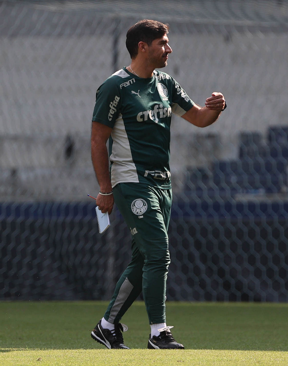 O técnico Abel Ferreira conversa com o elenco durante treinamento no estádio do Emelec (Foto: Cesar Greco/Palmeiras/by Canon)