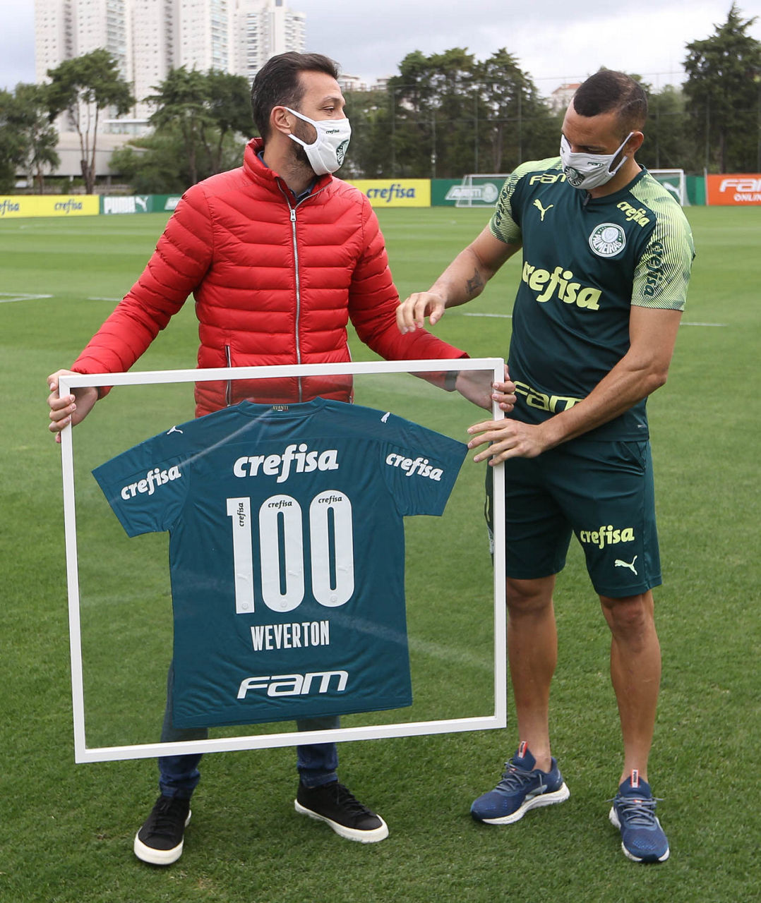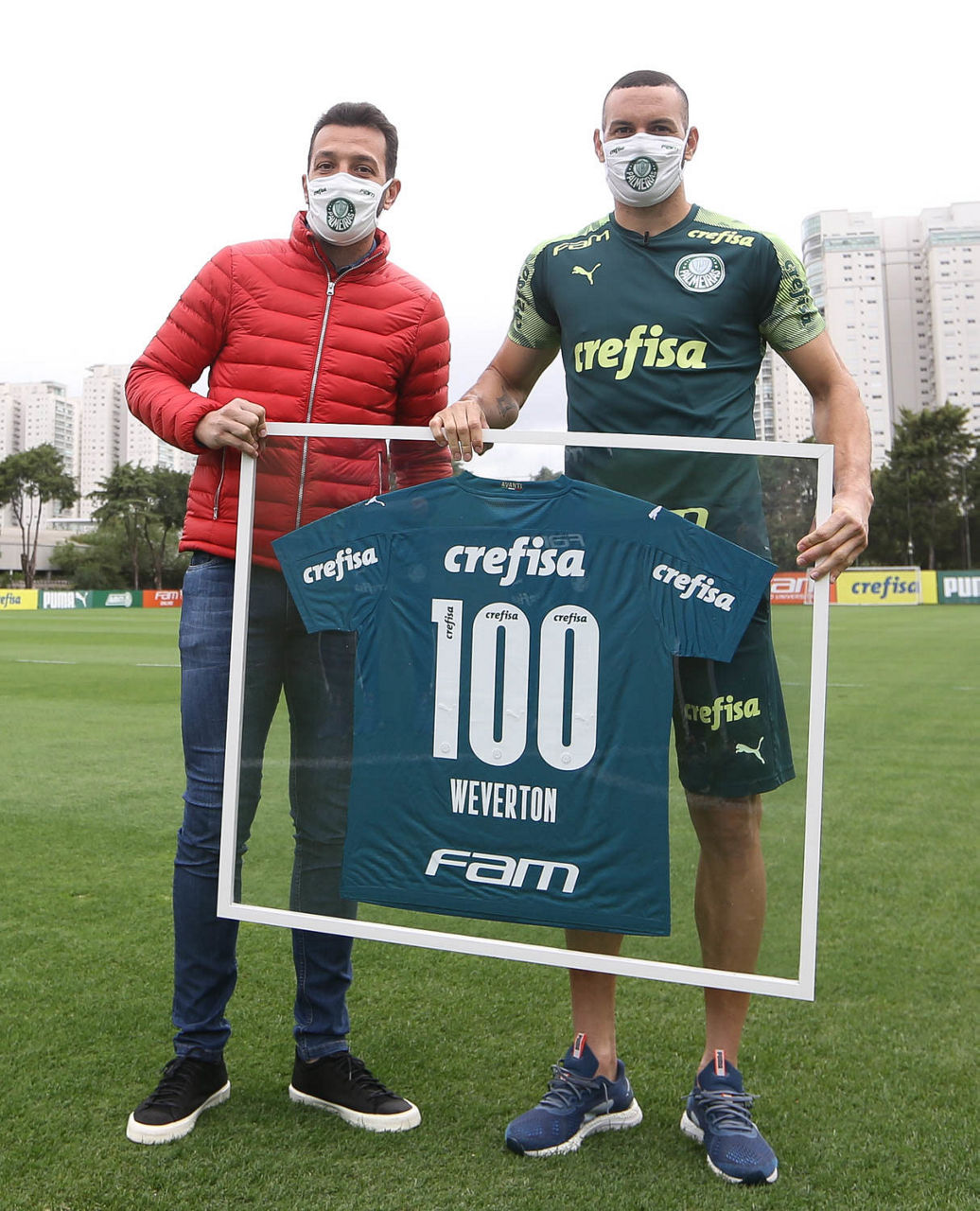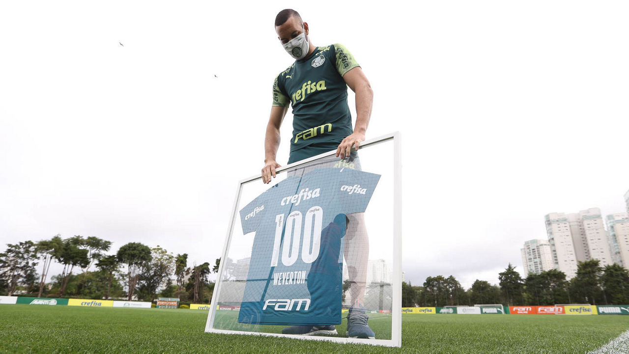 Um dos destaques da vitória por 2 a 0 sobre o Santo André, na quarta-feira (29), pelas quartas de final do Campeonato Paulista, o goleiro Weverton celebrou nesta quinta (30) o feito de ter alcançado mais de 100 partidas pelo Palmeiras, obtido pouco antes da pausa das competições por conta da pandemia do novo coronavírus. Atualmente com 106 jogos pelo Verdão, ele recebeu das mãos do ex-zagueiro e atual assessor técnico do clube, Edu Dracena, um quadro com uma camisa comemorativa.